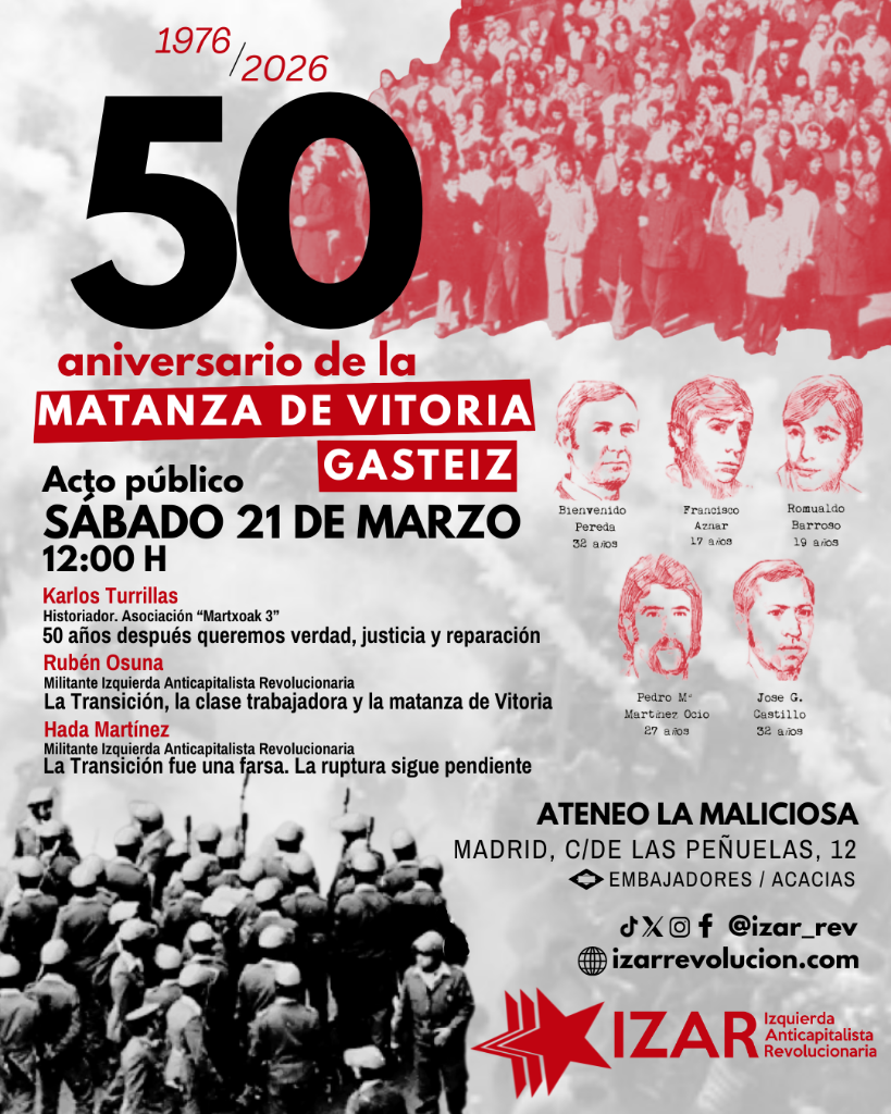 El 3 de marzo de 1976, en plena «modélica» Transición, la Policía Armada, a las órdenes del «padre de la Constitución» Manuel Fraga, desalojó de una iglesia a 4.000 trabajadores que estaban reunidos en asamblea, dejando cinco asesinados y centenares de heridos. Recordaremos su lucha y su legado.