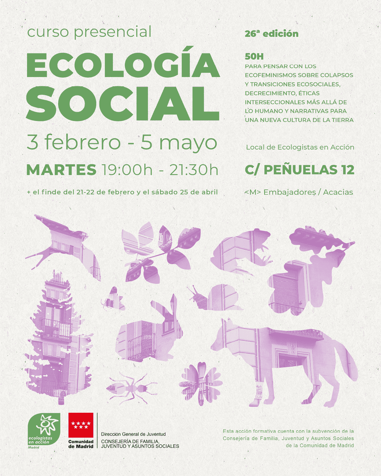 Ecologistas en acción, en colaboración con la Escuela Pública de Animación de la Comunidad de Madrid, te ofrecemos la posibilidad de formarte en Ecología Social con este curso que combina teoría y práctica. No es necesario tener experiencia previa en temas medioambientales para participar, y en caso de que la tengas podrás adquirir nuevas herramientas y ponerlas en práctica, tanto a nivel personal como colectivo o profesional.