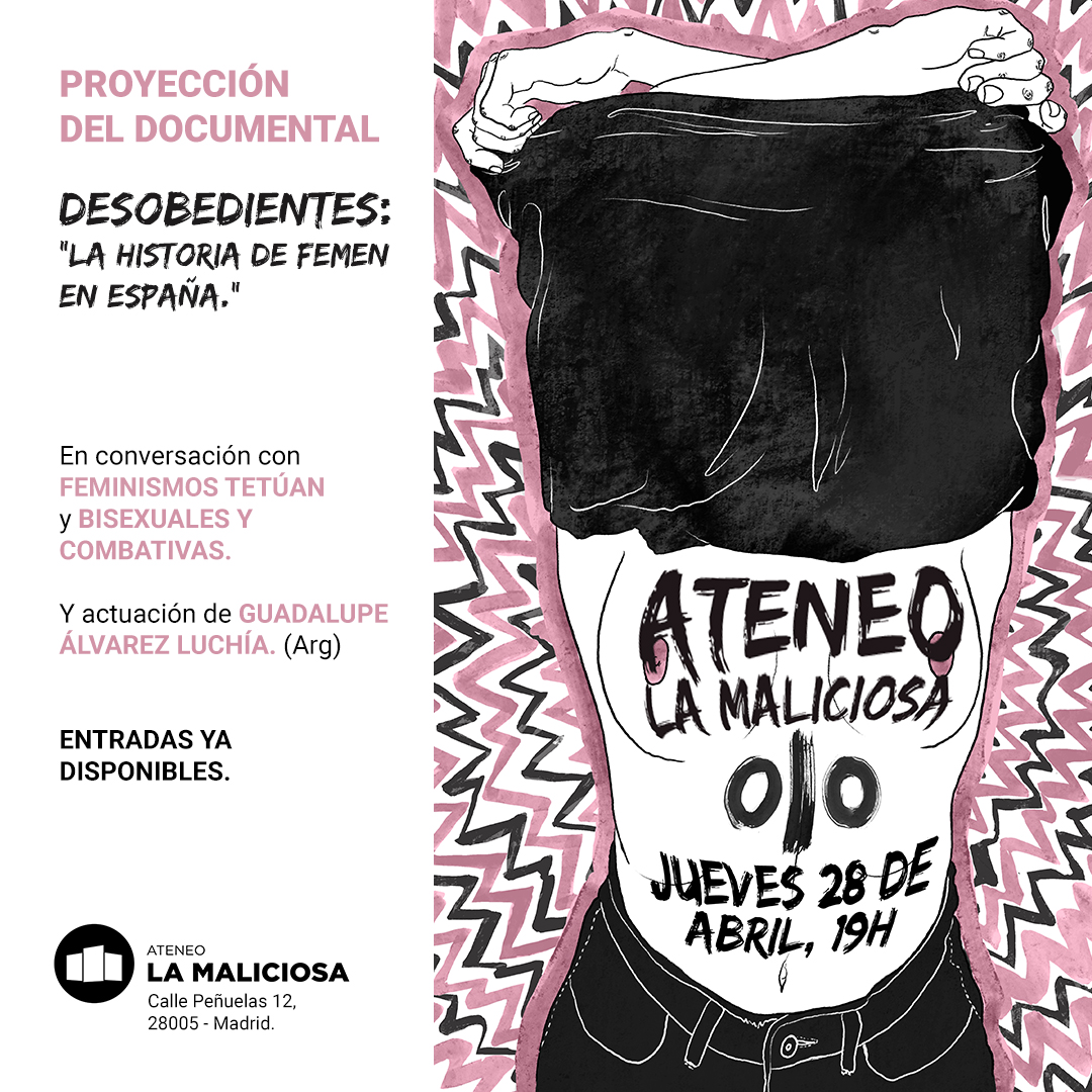 Proyección del documental Desobedientes: La historia de Femen en España. Con las intervenciones de Feminismos Tetuán, Bisexuales y Combativas, y la actuación de Guadalupe Álvarez Luchía (Arg.)