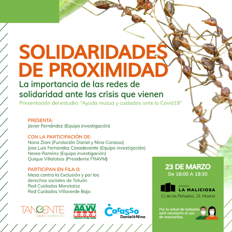 El acto de presentación de “Solidaridades de proximidad. Ayuda mutua y cuidados ante la Covid19” será el próximo miércoles 23 de marzo, a las 18:00, en el Ateneo La Maliciosa (calle de las Peñuelas, 12, Madrid), con entrada libre hasta completar aforo. En la presentación participará el equipo de investigación de Tangente, el Presidente de la FRAVM, Quique Villalobos; y Nana Ziani, de la Fundación Daniel y Nina Carasso. Asimismo, se contará con la participación en fila cero de la Mesa contra la Exclusión y por los Derechos Sociales de Tetuán, la Red de Cuidados de Moratalaz y la Red de Cuidados de Villaverde Bajo.