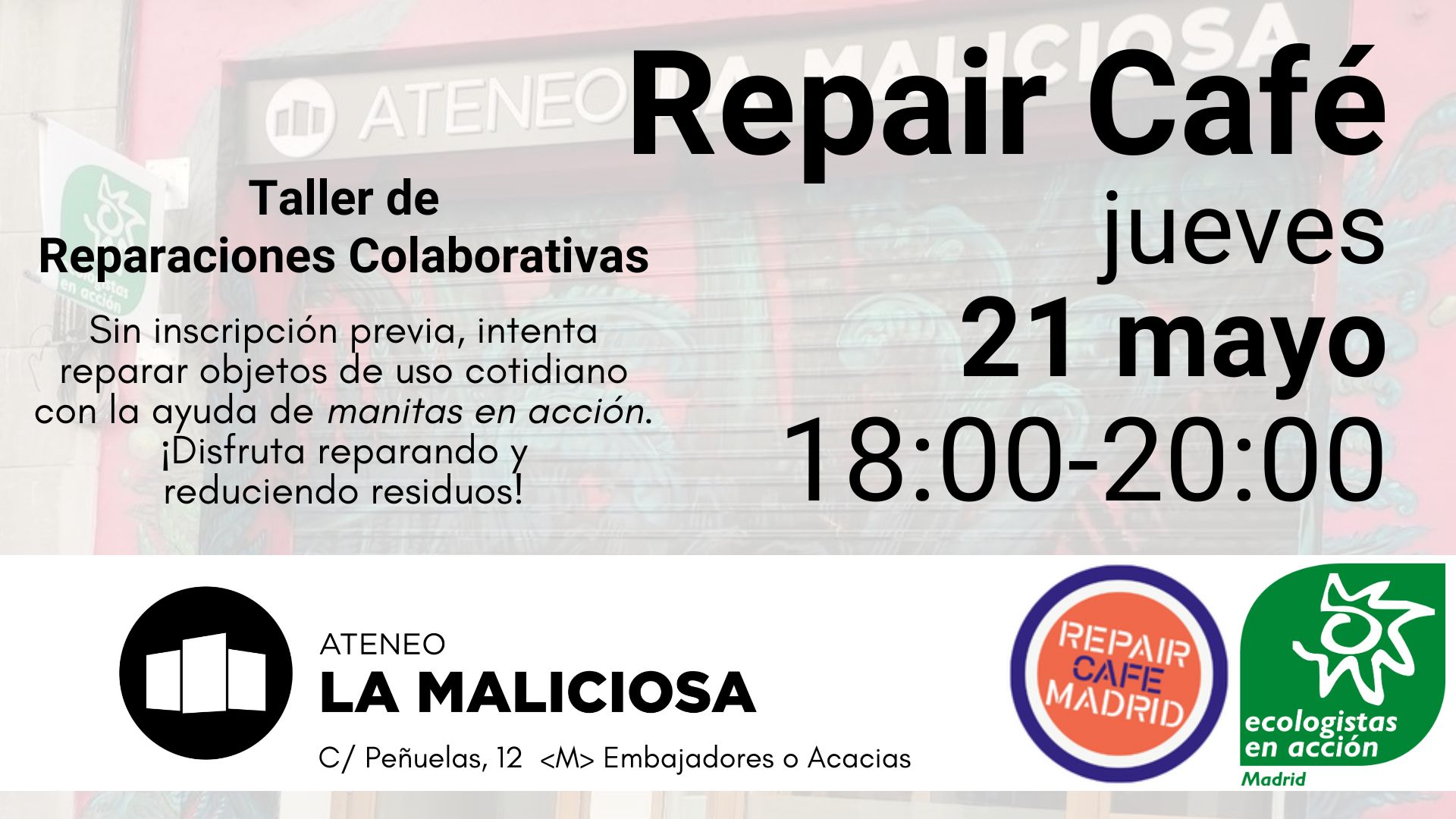 Es un taller abierto al público en general, con el objetivo de que intentes reparar, en un ambiente lúdico, objetos de uso cotidiano que nos rodean, aparatos eléctricos o electrónicos, juguetes, etc, para lo que contarás con la ayuda de personas (más o menos) manitas en acción. ¡Disfruta reparando y reduciendo residuos!